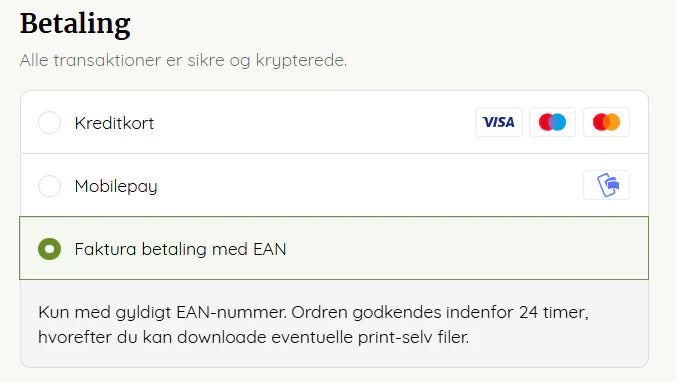Køber du digitale print-selv produkter med dit EAN-nummer? Så får du dem ikke tilsendt lige med det samme - som du gør hvis du betaler med betalingskort.